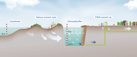 PWN wil tussen 2029 en 2032 de Klimaatbuffer IJsselmeer aanleggen. Een 150 hectare groot natuurgebied met daarin een landschap dat het IJsselmeerwater voorzuivert, en 100 hectare nieuwe voorraadbekkens.