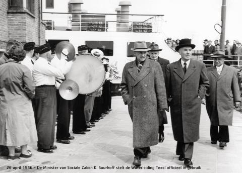 26 april 1956, de minister van Socoale Zaken, K. Suurhoff stelt de waterleiding Texel officieel in gebruik