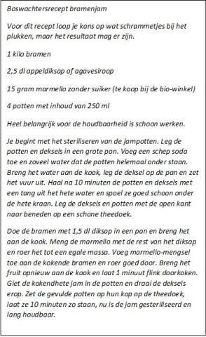 Als kind plukte ik met mijn ouders al bramen. Thuis hadden wij negen kinderen en zijn allen grootgebracht met het sap van de braam, wat de mensen in deze omgeving geen sap maar nat noemen. In de vorm van jam kun je de braam goed conserveren voor de winter. Maak niet de fout om je hele voorraad in een niet geïsoleerde schuur te zetten, zoals mijn moeder ooit eens deed. Bij strenge vorst ging de hele voorraad van zeventig flessen sap verloren. Stuk gevroren.